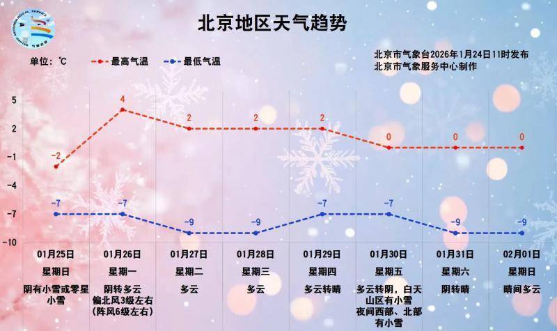 1月25日至2月1日白天最高气温-2~4℃,夜间最低气温-9~-7℃。
