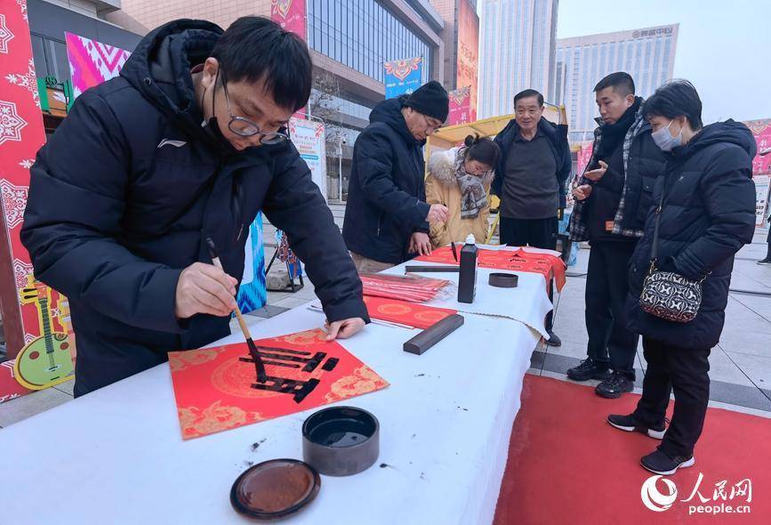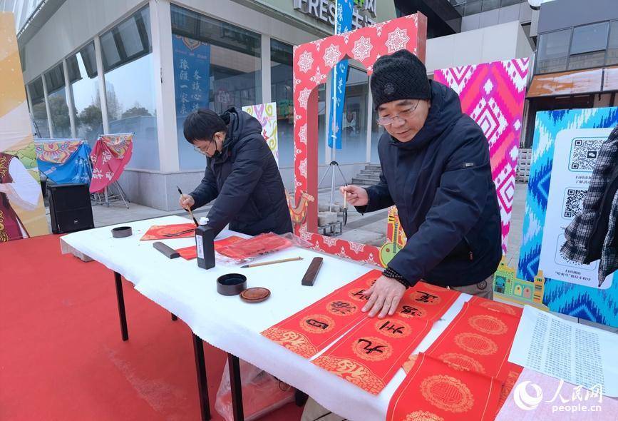 文化展演与互动环节更添温情。专业书法老师现场挥毫,春联墨香与新疆纹饰相映成趣,免费赠予市民新春祝福。“铸牢中华民族共同体意识”答题活动同步升温,市民通过小程序参与答题,即可角逐“冰碴驹俐”山羊、新春大礼包等丰厚奖品,在互动中深化对两地文化的了解。