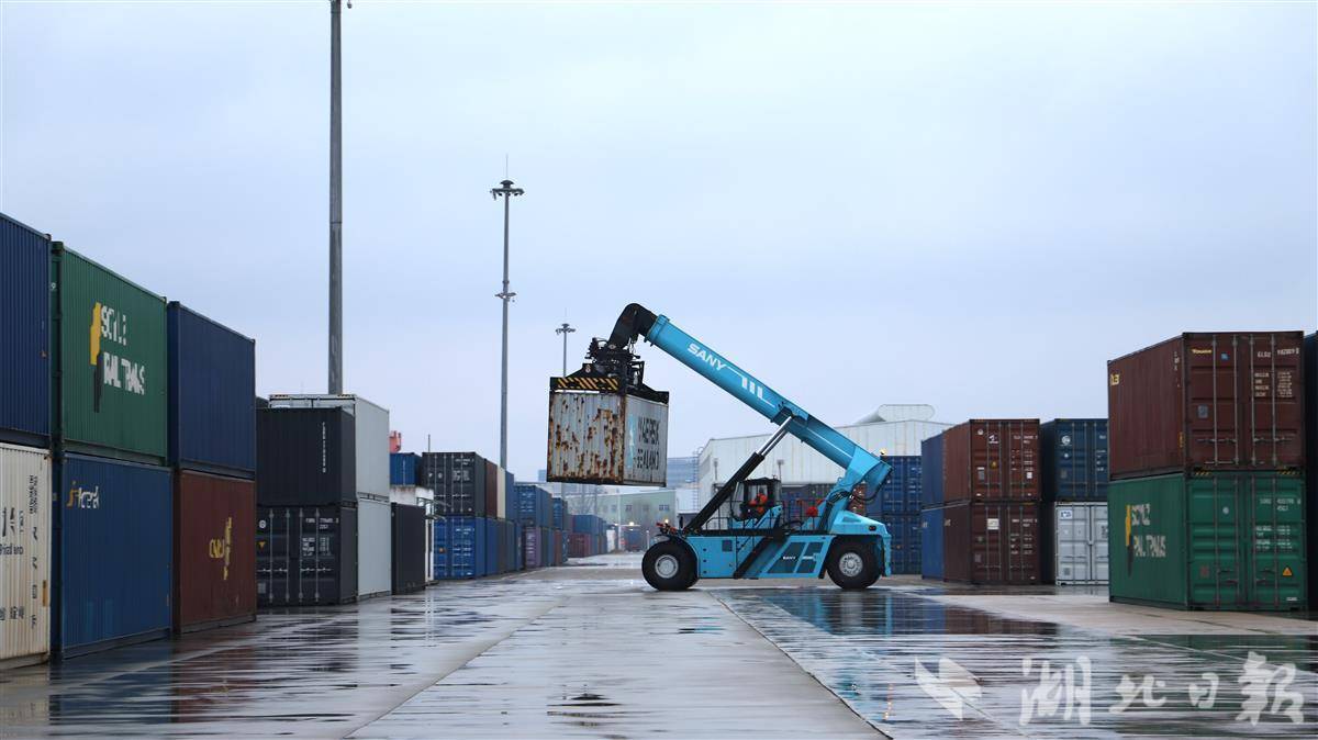 正面起重机正在吊运货物。湖北日报全媒记者 甄子萱 摄。