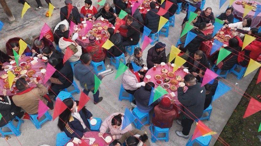 席间,乡亲们围坐一堂、举杯同庆,畅叙家常里短,聊在外打拼的酸甜过往,谈家乡发展的喜人变迁,话新年生活的美好蓝图。欢声笑语间,年味愈发浓郁,浓浓的乡情在大院里静静流淌。“党的政策好,这两年农业丰收,外出打工也挣到钱了。”村民孔祥勇笑着说,看着家乡一年一个新模样,孩子们归家团圆,乡亲们聚在一起吃八大碗、摆龙门阵,“这日子才叫安逸,这年才过得有味道!”