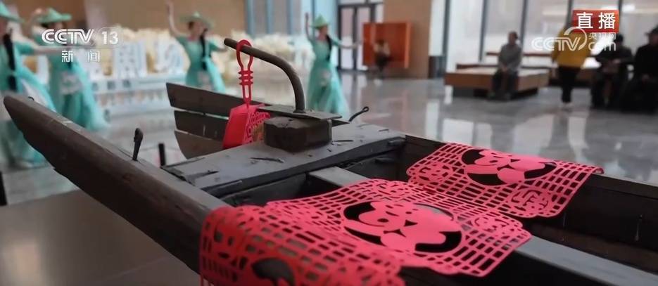 记者旁边这个是一艘船龄超70年的老船。您看它形体狭长,头尾微微上翘,坚固又轻盈。可能您也猜到了,没错,这条是龙舟。洞庭湖汨罗江畔是龙舟文化发源地之一,这里河网交织,以龙舟为主体的舟楫文化历史悠久,这一组展陈带您一进门就进入“洞庭世界”。