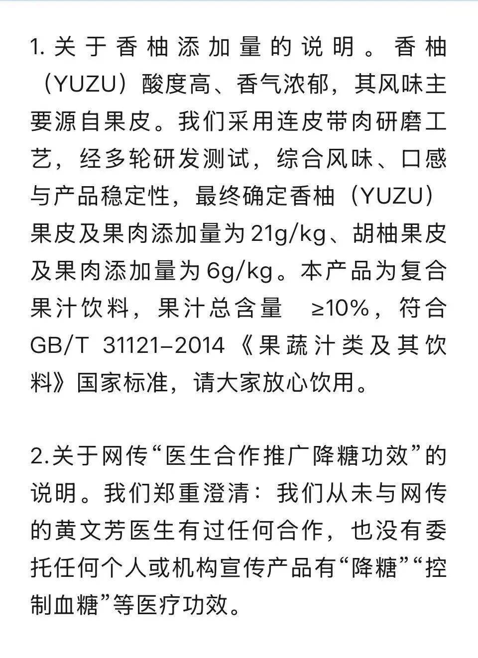 r宋柚汁通过其官方号发声表示,宋柚汁是复合果汁饮料,果汁总含量≥10%,符合GB/T 31121-2014《果蔬汁类及其饮料》国家标准,请大家放心饮用。并对网传“医生合作推广降糖功效”以及宣传修改等做了说明。